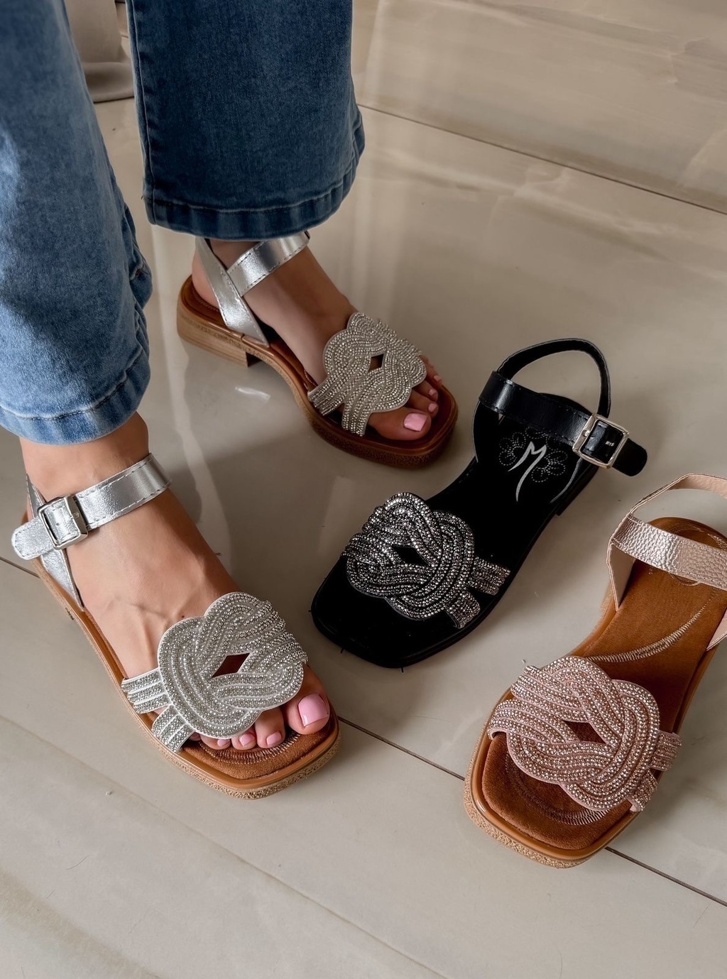 Su diseño moderno presenta un detalle protagónico: un nudo trenzado cubierto de strass brillantes que aporta un toque sofisticado y único. La tira en el talón con hebilla regulable garantiza un ajuste perfecto y cómodo.