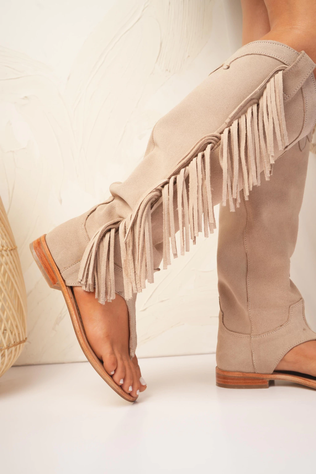 Marcá tendencia con las exclusivas Sandalias Boots ATHENAS, el calzado que fusiona la esencia bohemia con un diseño único y distinto. Confeccionadas en cuero gamuzón de alta calidad, ofrecen una textura suave y una base artesanal que resalta su autenticidad.