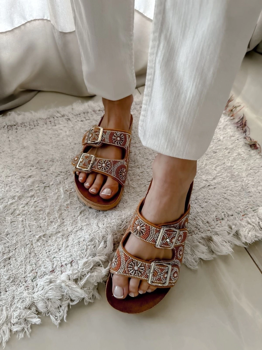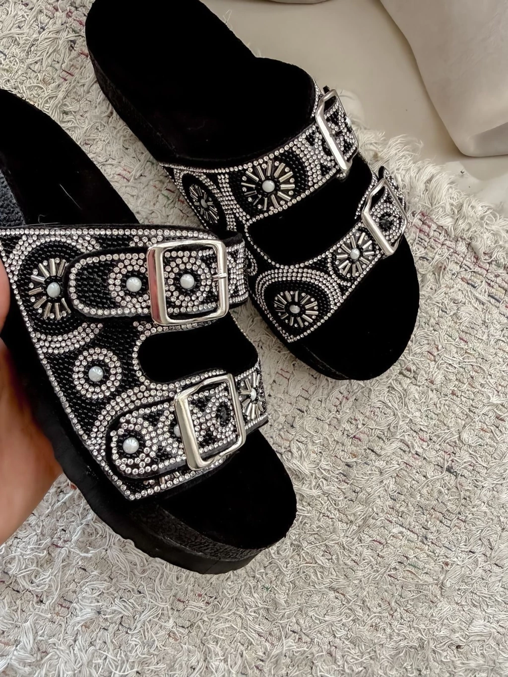 MATERIAL: Birk que combinan comodidad absoluta con un toque de glamour artesanal. Capellada con apliques de mostacillas y cabujones, tira entre-dedos. Además posee dos hebillas en plata (no son regulables)